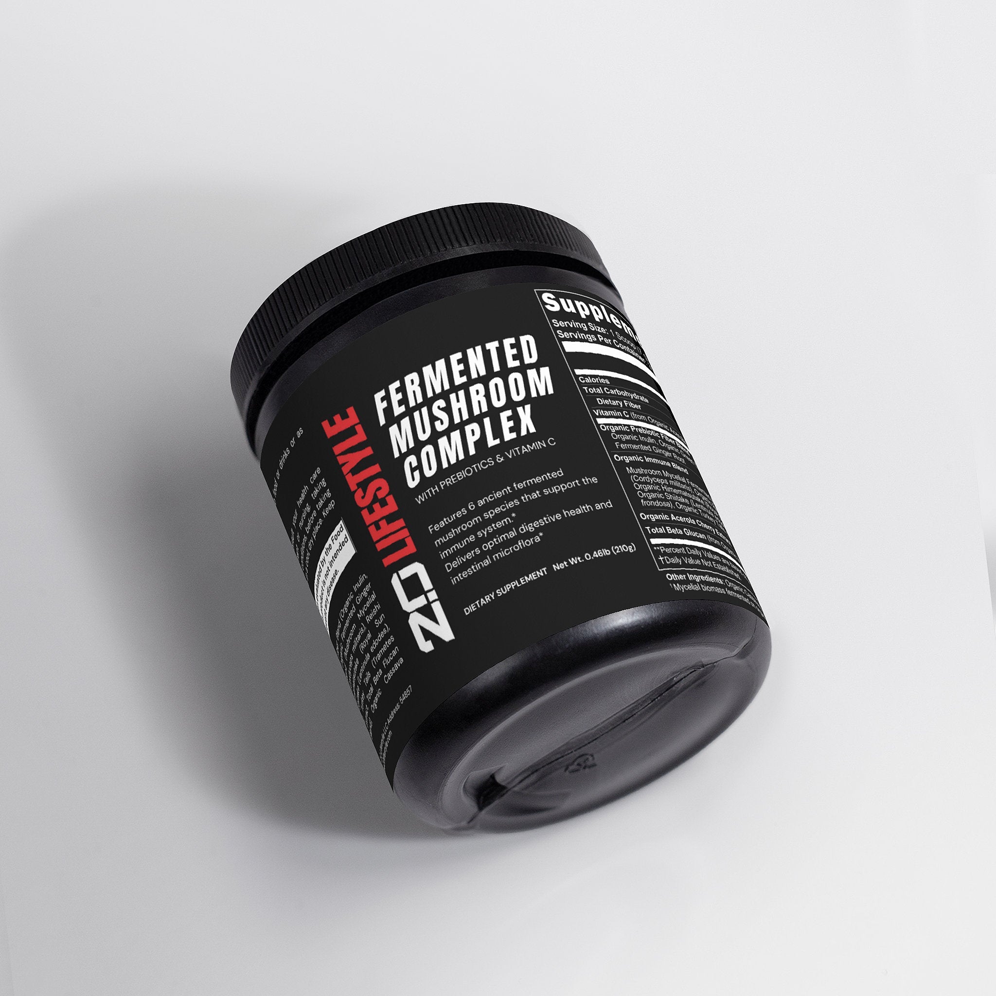Ingredients: Vitamin C, Organic Prebiotic Fiber Blend (Organic Inulin, Organic Green Tea Extract, Organic Fermented Ginger Root), Organic Immune Blend (Mushroom Mycelial Biomass Blend,[Cordyceps (Cordyceps militaris), Reishi (Ganoderma lucidum), Himematsutake (Royal Sun Agaricus) (Agaricus blazei), Shiitake (Lentinula edodes), Maitake (Grifola frondosa), Turkey Tails (Trametes versicolor)], Acerola Cherry Extract, Total Beta Flucan (from Organic Immune Blend), Organic Cassava Maltodextrin