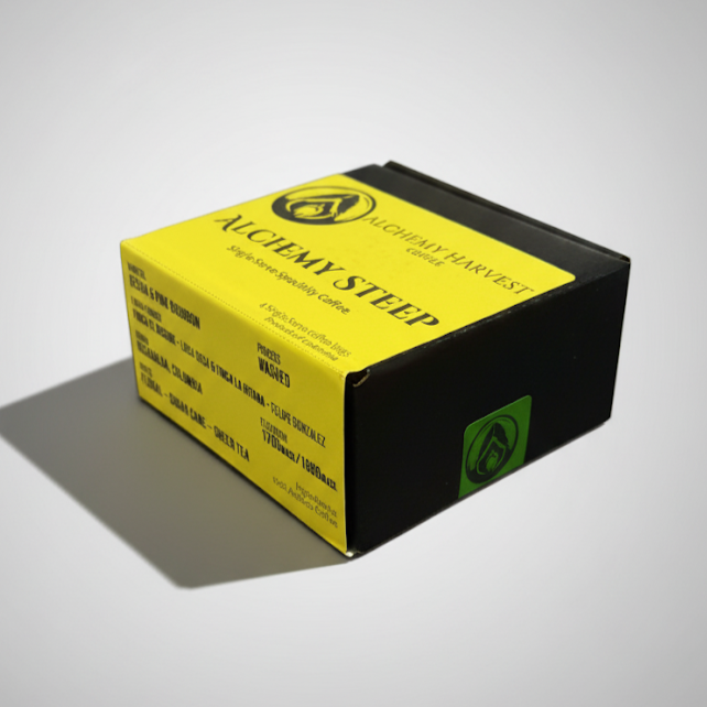 From the lush elevations of Risaralda, Colombia, Alchemy Steep brings together two rare and exquisite varietals: the ethereal Gesha and the vibrant Pink Bourbon. Expertly pre-ground and packed into single-serve steeping bags, this blend is crafted for effortless brewing—whether you're craving a comforting hot cup or a refreshing cold brew.