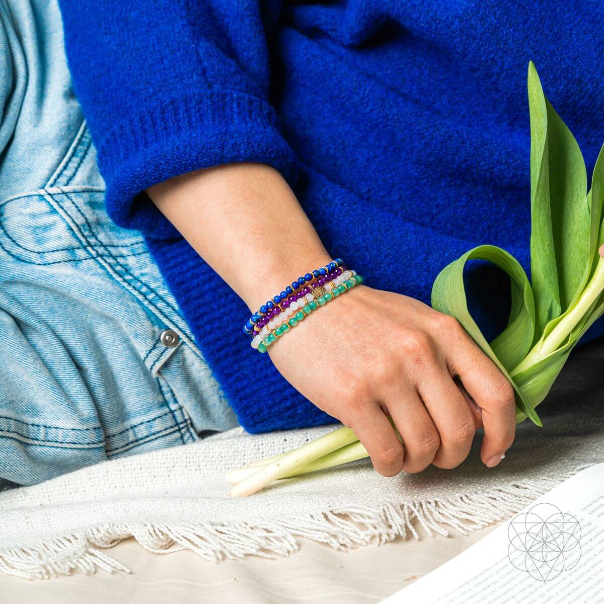 Place Amethyst and Chalcedony on the left wrist and Lapis Lazuli and Green Aventurine on the right to evoke healing, dismantle doubt, and ground your energy in the supportive love surrounding you. For immediate luck, stack the set on the right hand to manifest positive outcomes. Stack set on the left hand to awaken to the signs and symbols sent to you for guidance.