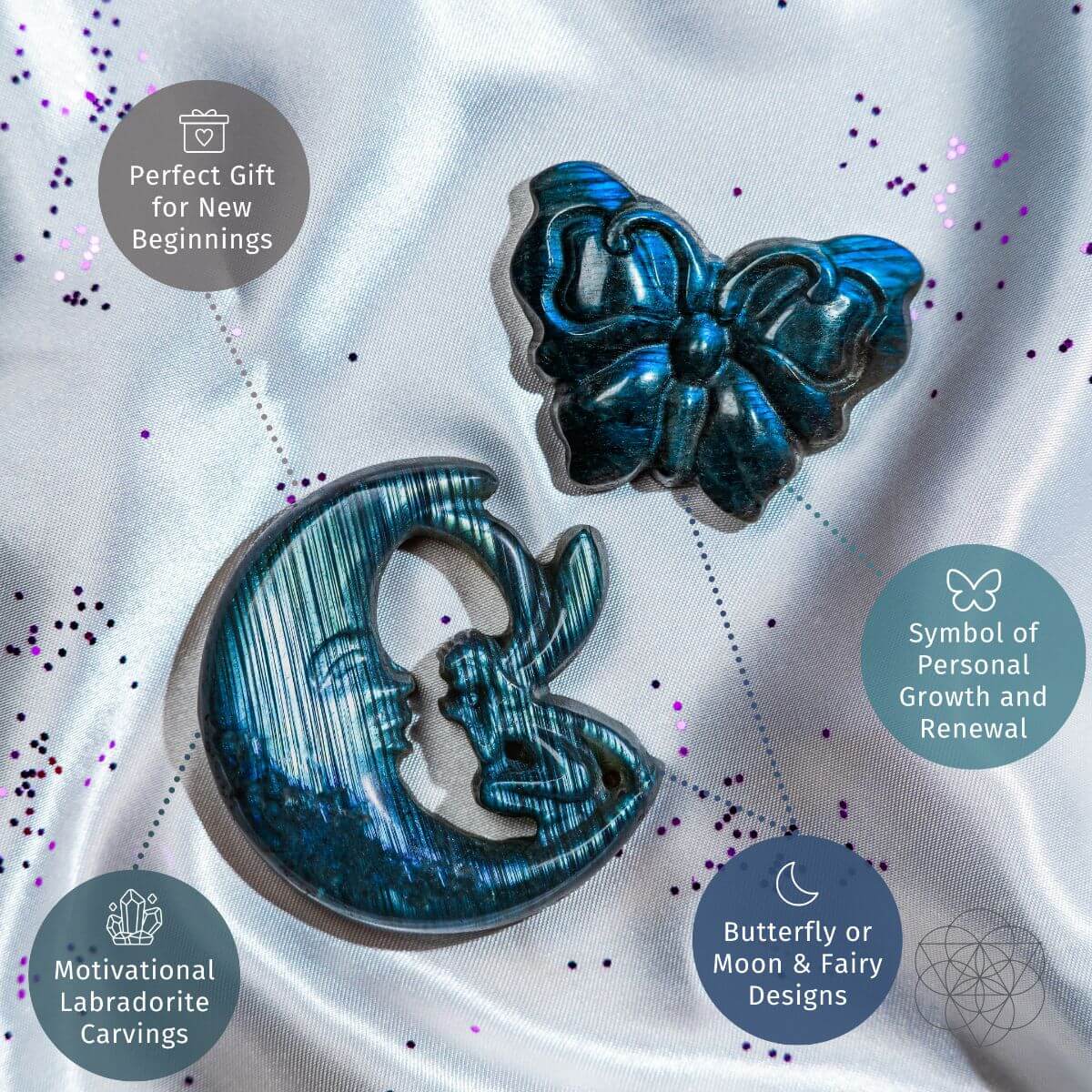 And if it's about reshaping your career or deepening personal connections, the Moon & Fairy Labradorite Carving can be your guide. It represents new beginnings and personal growth, much like the cycle of the moon.