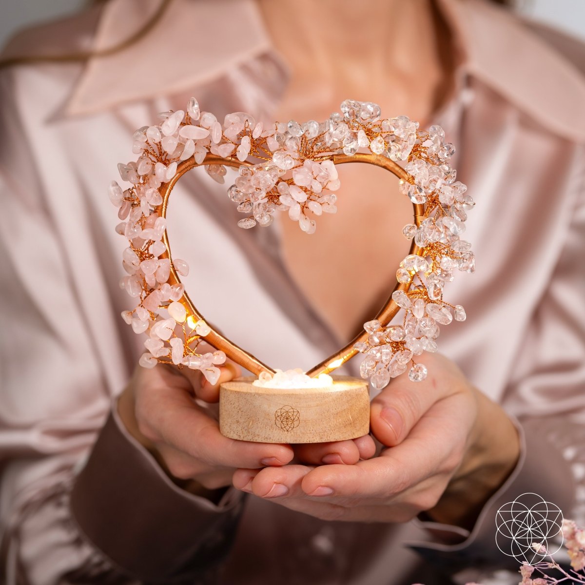 To mend a broken heart, Mother Nature calls upon her crystal of unconditional love: Rose Quartz. In beautiful hues of pale pink, this natural stone emits gentle vibrations of joy and emotional healing. Petals of Rose Quartz bloom and cascade from the heart-shaped tree, pouring radiant love into your empty heart.